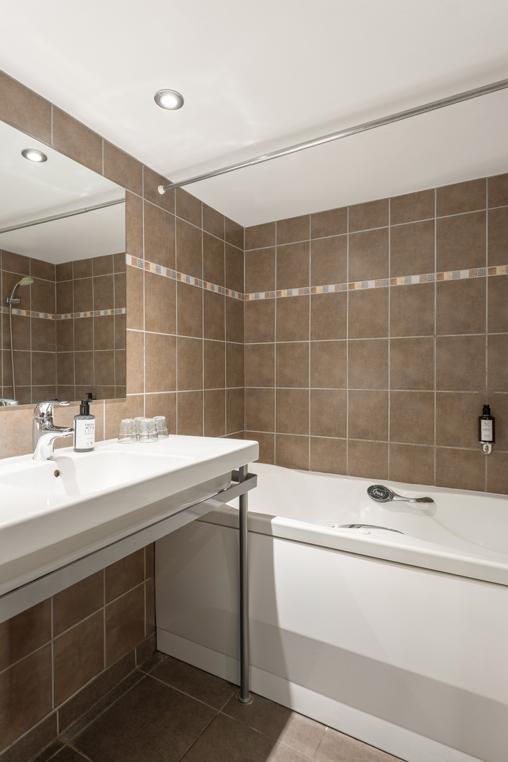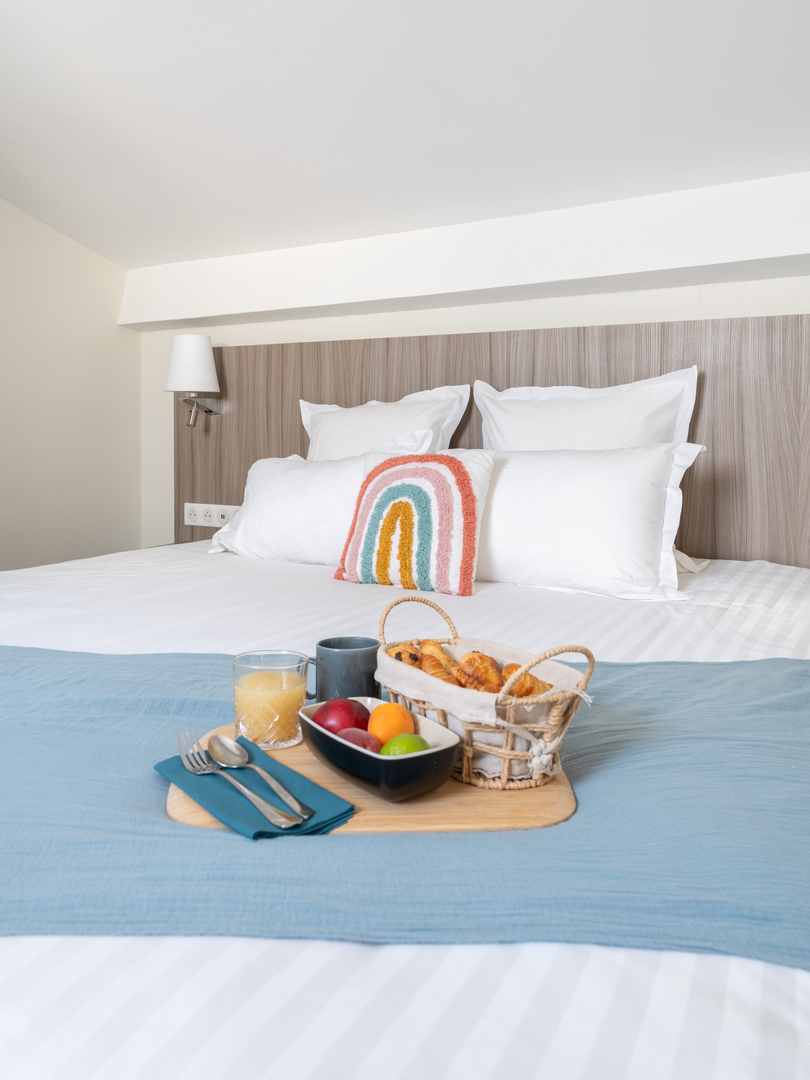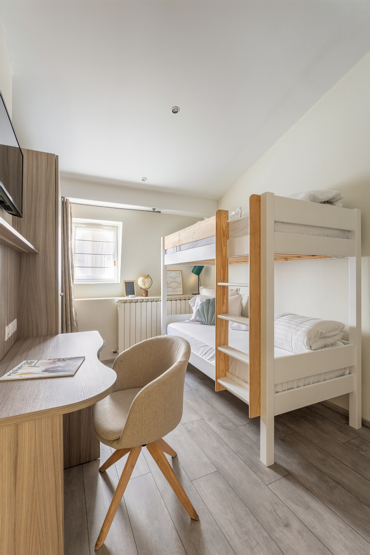 Progettata come un piccolo bozzolo su due livelli, la camera quadrupla accoglie le famiglie in uno spazio abitativo di 22 m². Letto king-size al piano superiore, letti a castello al piano inferiore, una vasca per fare il bagno a fine giornata, un’area studio e tutti i comfort di cui hai bisogno.